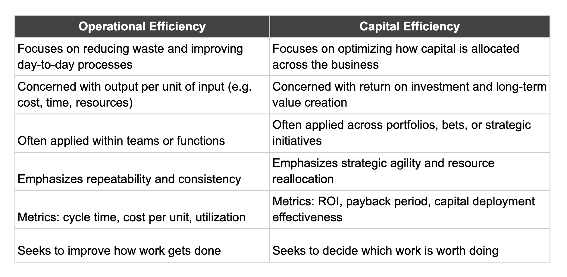 As commonly discussed, efficiency is basically about doing more with less or doing something with less "waste." It is an important view. However, it is not the same as capital efficiency, which centers around using sources of capital (including human "capital") to achieve your long-term strategic goals.
